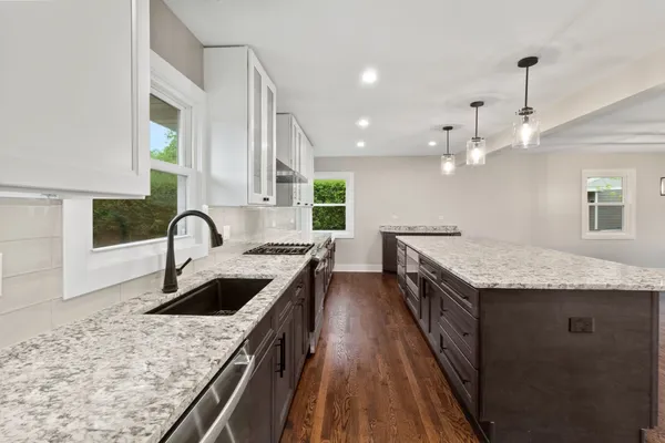 The heart of this home is undoubtedly the kitchen. Our team removed walls and completed strategic structural modifications to dramatically open the space. This allowed for a sprawling layout with enhanced flow between the kitchen, dining, and living areas. The remodeled kitchen features ample cabinetry, modern lighting, premium countertops, and an oversized island perfect for both cooking and gathering. Natural light now floods the space, making it a warm and inviting centerpiece of the home.